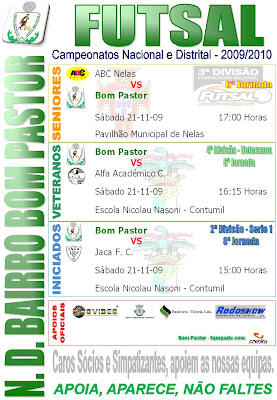 Seniores: O Bom Pastor deslocou-se a Nelas para defrontar a equipa da casa onde o resultado não foi o que tínhamos trabalhado ao longo da semana para conquistar, um resultado negativo, onde mais uma vez, não podemos deixar de salientar o trabalho negativo da equipa de arbitragem que teve o seu peso neste mesmo resultado. Já por duas vezes que vamos jogar fora e a Equipa de Arbitragem é do mesmo Distrito das equipas da casa, ( como é que isto pode ser possivél ), dois jogos onde o Bom Pastor tem muitas razões de queixa nesses mesmos encontros, agora em relação ao encontro não há muito a dizer. Bom Pastor a entrar melhor em campo e a conseguir logo uma vantagem de 0/2 nos primeiros minutos que mostrava que ia ser um jogo muito fácil para a nossa equipa. Depois surgiram sem que ninguém esperasse uma oferta por duas vezes consecutivas da nossa equipa a dar dois golos oferecidos/consentidos a equipa da casa. Depois do empate, há que surge os árbitros a querer evidenciarem-se ao assinalar uma grande penalidade contra o Bom Pastor, quando partíamos para o contra-ataque, deixando tudo de boca entre aberta, mesmo os membros da equipa da casa. Com o terceiro golo a surgir na origem dessa grande penalidade foi o descalabro total da equipa chegando ao intervalo a perder por um resultado de 5/3. Na segunda parte foi continuar a lutar contra 2 equipas o Nelas e a equipa de arbitragem e para piorara as coisas ainda contra a falta de sorte que mais uma vez não esteve do nosso lado, pois mais uma vez não faltaram bolas aos ferros da baliza da equipa adversária, como já bem a ser um habito nos jogos do Bom Pastor. Assim terminamos com um resultado negativo para as nossas aspirações de 8/6, mas enganador pelo que o Bom Pastor fez. O Bom Pastor entrou em campo com o seguinte cinco inicial: Pistolas; Vitinha; Calão; Kiko e Vigário, Jogaram ainda: China; Soviético; Hugo; Rica; André Rios ( Expulso por acumulação de Amarelos ) e Renato ( entrou para o lugar de Pistolas expulso por Vermelho Directo ). A que continuar a trabalhar, pois ainda nada está perdido e temos que mostrar que estamos preparados para lutar contra tudo e todos. Força Rapazes e vamos partir para as VITÓRIAS.