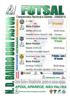 Seniores: Deslocação que se avizinhava muito dificel, ao reduto do 1º. Classificado o S. João, o Bom Pastor a entrar em campo com o seguinte 5: Pistolas ( Guarda-Redes ), André Rios; Mino; Calão e Vigário, jogo na primeira parte onde a equipa visitada entra muito bem em campo, a pressionar logo desde o apito inicial. O Bom Pastor com uma marcação muito acertada, não se deixou intimidar e fez uma excelente primeira parte, acabou por sofrer o golo a cerca de 7 minutos para o intervalo, numa troca impressionante de bola pela parte do S. João, onde o nosso guarda-redes Pistolas nada pode fazer, para segurar o remate cruzado de fora de área. Bom Pastor não se deixou impressionar e passados cerca de 4 minutos num lance de contra-ataque e um pouco confuso Hugo em cima da linha de golo consegue estabelecer a igualdade após uma defesa incompleta por parte do guarda-redes do S. João. Fomos para descanso com o resultado de 1/1, que se ajusta ao que ambas as equipas fizeram. Inicio da segunda parte igual ao da primeira, S. João novamente a pressionar muito e o Bom Pastor a continuar a defender, mas a falta de pernas por parte dos nossos jogadores, pois o nivel de futsal por parte do S. João era muito forte na troca do esférico, levou a que fizesse-mos várias faltas, chegando o 2/1, após a marcação de um livre. Depois foi tentar segurar o mais que podessemos, mas era uma tarefa muito difícel, veio o 3/1, quando o Bom Pastor antes teve opurtunidades para ter reduzido e conseguido mesma a vantagem se não fosse a falta de sorte por parte dos nossos Atletas, depois com 5 faltas já efectuadas pela nossa parte, o S. João com muita experiência consegue arrancar 3 livres directos que deram mais 3 golos. Assim chegamos ao final do encontro com um resultado muito pesado de 6/1, o qual não merecíamos pelo que fizemos ao longo da partida. Resultado sem contestação, pois o S. João foi um justo vencedor. Lamentar as provocações no final do encontro por parte da assistência do S. João que nada traz de bom para a modalidade e que gerou alguns confrontes verbais entre ambas as claques. A que levantar a cabeça, pois temos um jogo já no próximo fim de semana também muito importante para as aspirações do Bom Pastor. Cumprimentos Luca Tony.